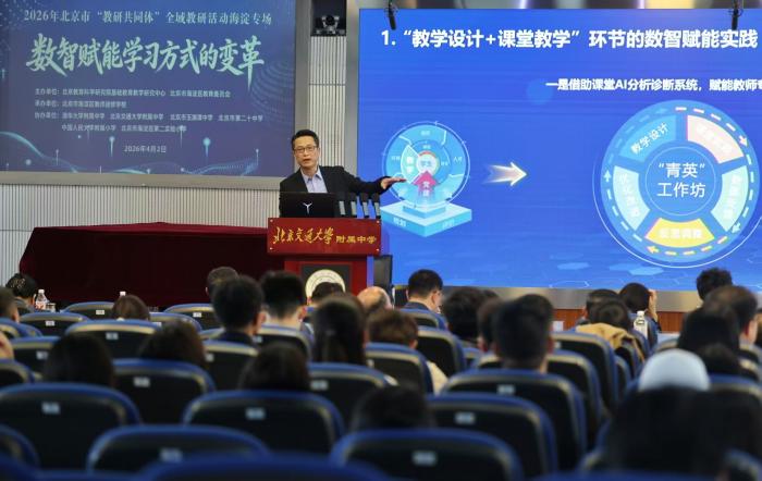 4月2日下午,2026年北京市“教研共同体”海淀区全域教研活动在交大附中分会场成功举办。教研活动聚焦数智赋能学习方式变革,集中展示北京交通大学附属中学教育数智化转型的实践成果。