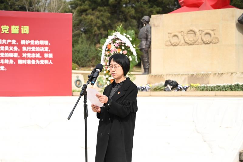 在八宝山革命公墓烈士纪念园红旗雕塑前,全体人员整齐肃立,伴随着庄严的《献花曲》,老山街道向为中国人民解放事业和共和国建设事业英勇献身的烈士敬献花篮,街道党工委书记周冲、办事处主任杨育忠缓步走向红旗雕塑,上前整理挽联,所有人员敬献鲜花、鞠躬行礼、寄托哀思,新入党党员在党旗前进行入党宣誓,老党员们重温入党誓词,党员代表以诗朗诵《新时代最可爱的人》向革命先烈和新时代英雄献礼。不忘本来,面向未来。党员们感怀精神,继承遗志,以铿锵誓言和实际行动,共圆伟大中国梦。随后,全体党员一同参观了党员干部政德教育基地。