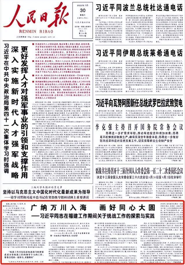 今年7月26日,《福建日报》第一至四版刊发重磅文章《广纳万川入海 画好同心大圆——习近平同志在福建工作期间关于统战工作的探索与实践》,这篇文章在7月30日被《人民日报》转载。