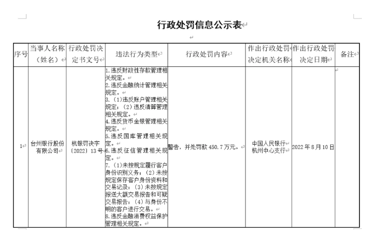 根据人民银行杭州中心支行公布的行政处罚信息显示,台州银行因违反财政性存款管理、征信管理、金融消费权益保护管理等相关规定,被处以警告并罚款450.7万元。