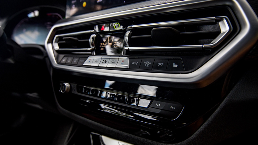 气候控制区域依然采用实体按键设计,中间的风量、出风口选择以及温度控制使用了更为明显的银色按键,温度、风量控制较为直观。常规的温度、风量、座椅加热等功能显示在空调出风口中间的小屏幕上,复杂的冷气开关控制、驻车通风等功能则是会显示在上方的中控屏中。下方多媒体控制区域的功能基本都集成在了上方的大屏中,除音量控制旋钮外,其他按键使用率不高。