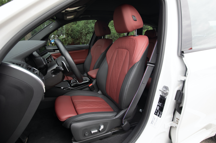 新X3的前排座椅采用Sensatec合成皮材质,造型比较偏向于运动,在激烈驾驶过程中座椅靠背、坐垫两侧的支撑性非常不错,不过在日常使用中体型稍胖的乘客会觉得座椅较窄,两侧护翼较硬。前排座椅带有8向电动调节以及手动腿托功能,主驾驶座椅带有四向电动调节的腰部支撑以及座椅记忆功能。