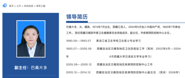 公开资料显示,她毕业于黑龙江省卫生学校卫生医士专业,1993年7月毕业后到了西藏自治区日喀则地区卫生防疫站工作。
