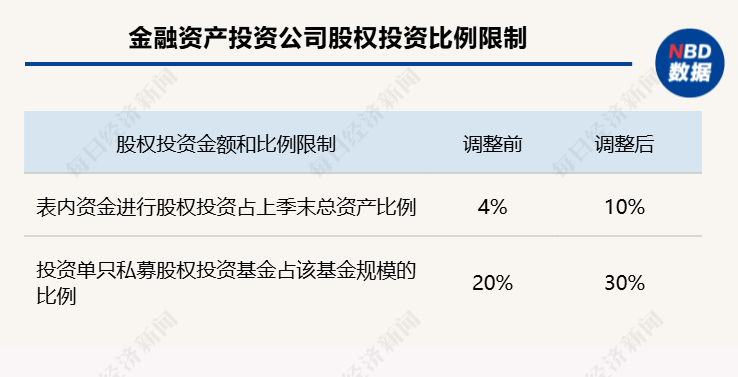 此外,适当放宽股权投资金额和比例限制,将金融资产投资公司表内资金进行股权投资的金额占公司上季末总资产的比例由4%提高到10%,投资单只私募股权投资基金的金额占该基金发行规模的比例由20%提高到30%。