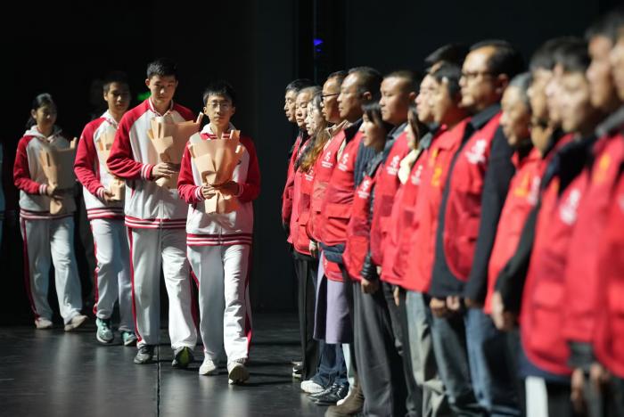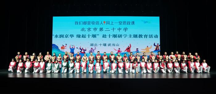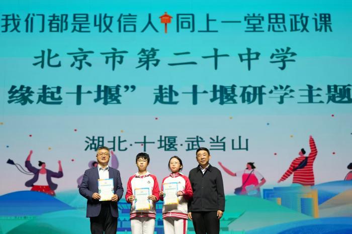 11月11日晚上,北京中学生千人研学团在湖北十堰举行主题教育活动。学生们为湖北十堰丹江口库区的“小水滴”环保志愿者代表送上鲜花,感谢他们对水源地“一泓清水”的守护。北京市第二十中学教育集团校长董红军与学生们一同被授予“京堰同心”小水滴志愿者荣誉称号,与丹江口库区人民共同践行守水、护水、节水、爱水之责。