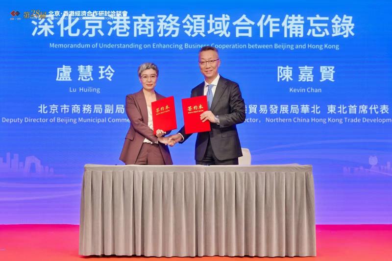 在签约环节,北京市商务局与香港贸易发展局代表共同签署深化京港商务领域合作备忘录,旨在建立长效合作机制,共同组织两地企业对接洽谈,相互支持在对方区域举办消费推广活动,为京港企业拓展市场提供精准政策与信息资源等。