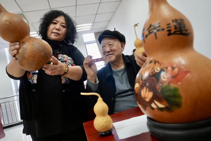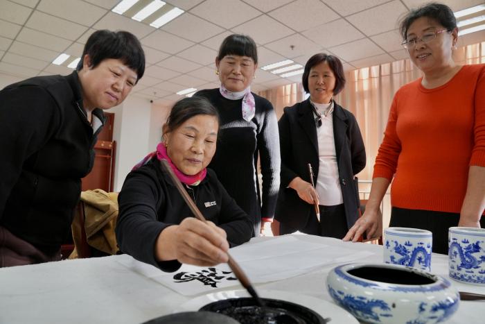 退休老人体验现场非遗项目。