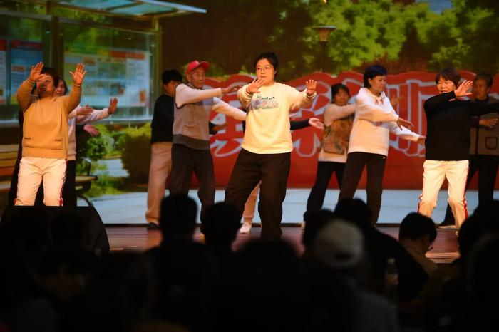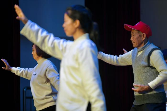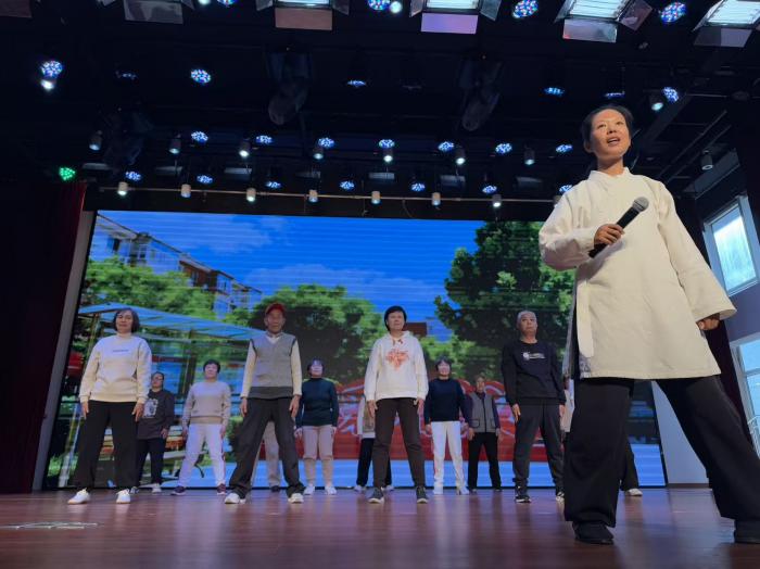 退休人员代表展演的太极五行养生操。
