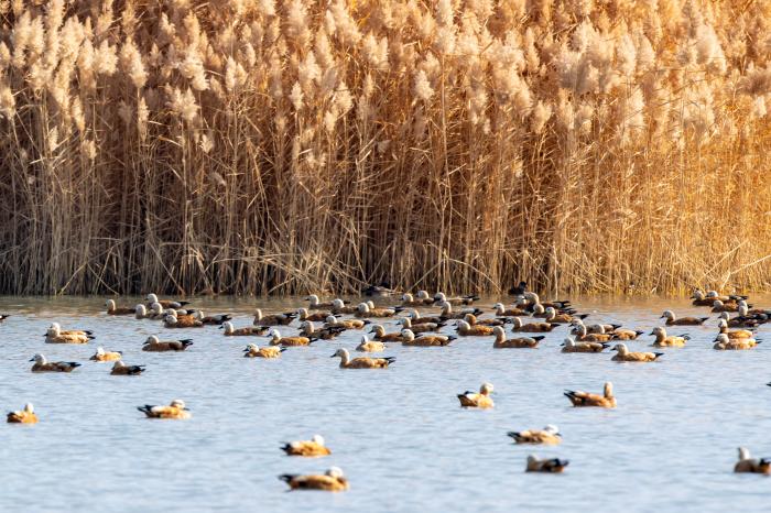 作为全球9条候鸟迁徙通道之一的中亚通道的重要中转站,每年约有18万至25万只水禽在张掖黑河湿地国家级自然保护区集结、停歇。11月12日,赤麻鸭等鸟类在张掖黑河湿地国家级自然保护区高台段一处湖泊休憩觅食。新华社记者 张智敏 摄