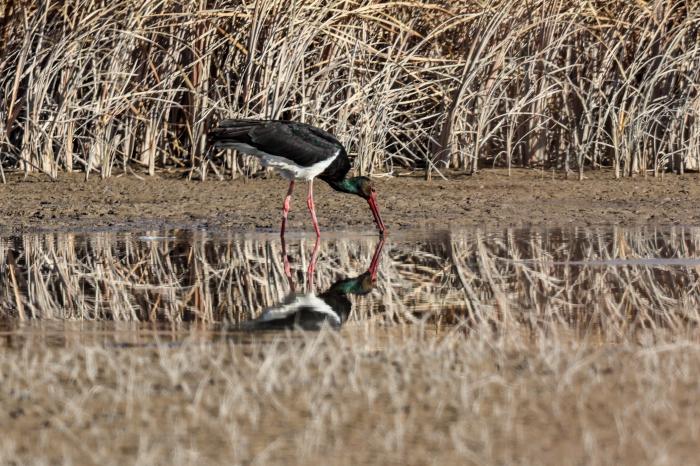 11月12日,黑鹳在张掖黑河湿地国家级自然保护区高台段一处湿地浅滩觅食。新华社记者 郎兵兵 摄