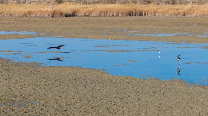 11月12日,黑鹳等候鸟在张掖黑河湿地国家级自然保护区高台段一处湿地浅滩休憩觅食(无人机照片)。新华社记者 郎兵兵 摄
