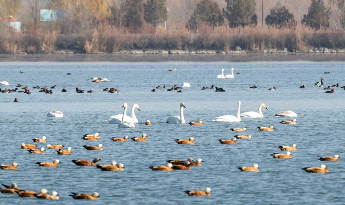 入冬以来,大批候鸟陆续飞抵位于甘肃省张掖市的张掖黑河湿地国家级自然保护区高台段休憩觅食。