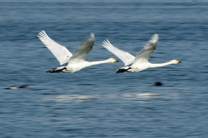11月12日,大天鹅在张掖黑河湿地国家级自然保护区高台段一处湖泊飞翔。新华社记者 张智敏 摄