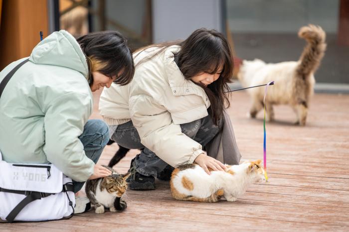 截至目前,园区内已救助600余只流浪猫,为了保障猫咪和游客的安全,园区内配备有包括宠物医生及饲养员在内的40多名工作人员,每日进行健康巡查,为游客提供与猫咪正确互动的指导。自今年1月初正式对外营业以来,已有50余只流浪猫被重新领养。1月14日,在重庆市南岸区南滨路萤火虫港湾猫猫主题乐园,游客和猫咪互动。新华社记者 黄伟 摄