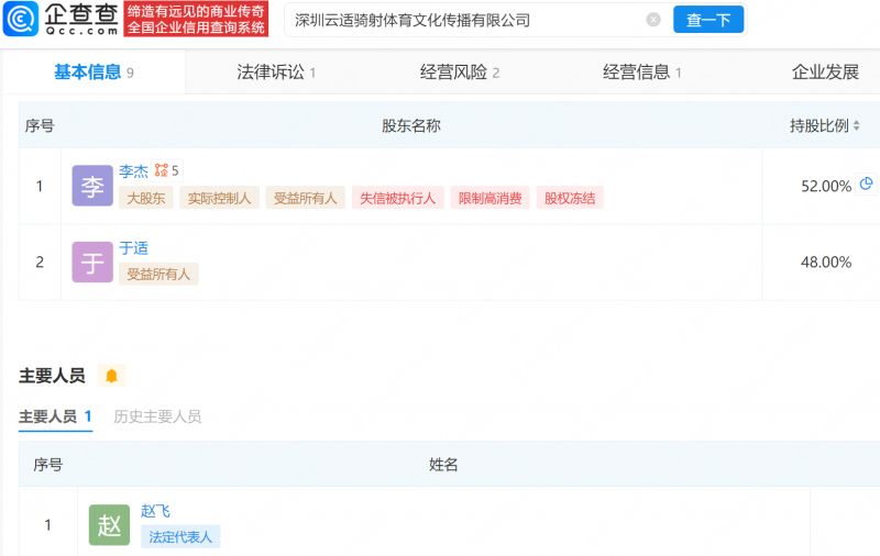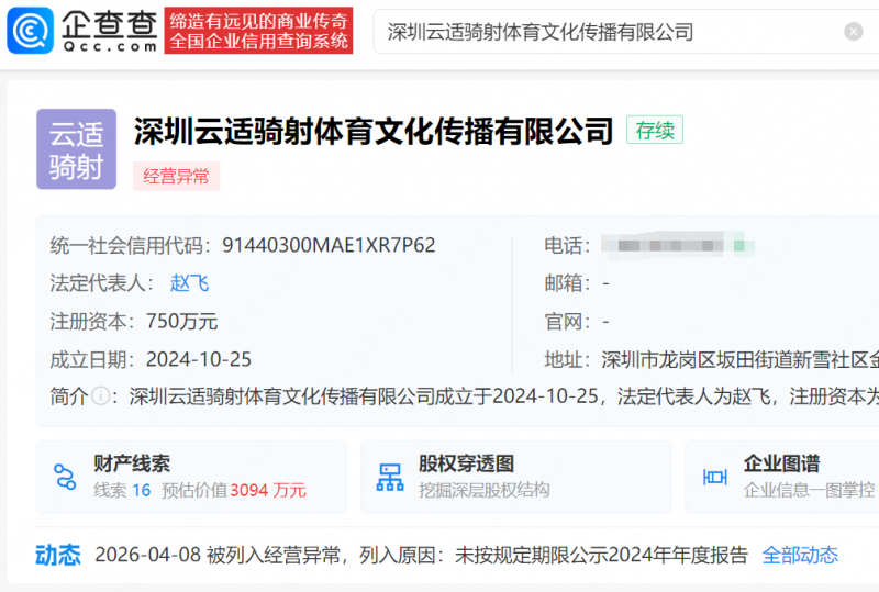 企查查APP显示,近日,深圳云适骑射体育文化传播有限公司因未按规定期限公示年度报告,被深圳市市场监督管理局龙岗监管局列入经营异常名录。该公司成立于2024年10月,法定代表人为赵飞,注册资本为750万元,经营范围包含体育赛事策划、体育竞赛组织、组织体育表演活动等,由李杰、于适分别持股52%、48%。