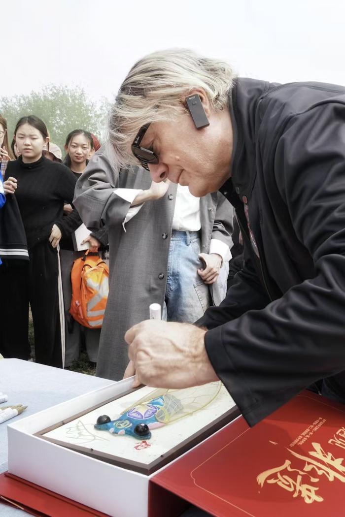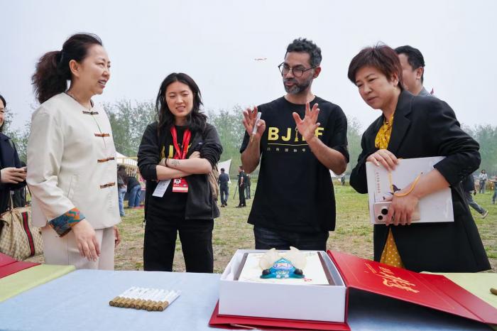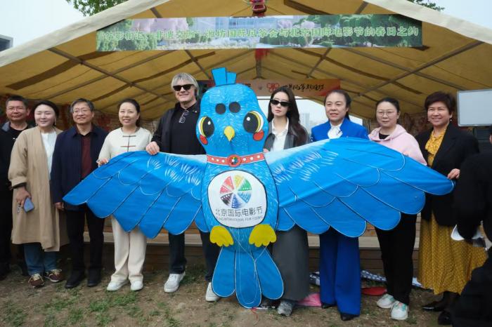 星光营地内,各式风筝迎风舒展。“天坛奖”评委西蒙·弗兰格林为北影节吉祥物“燕喜儿”定制风筝手绘点睛,以非遗仪式祈福纳祥。