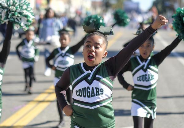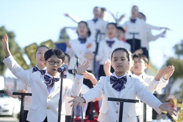 在美国洛杉矶,孩子们参加马丁·路德·金纪念日游行活动。