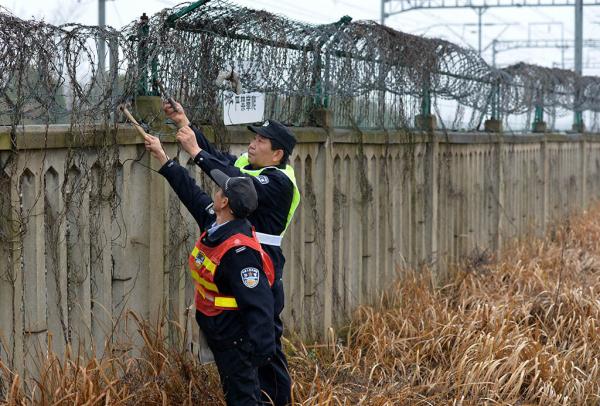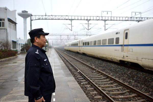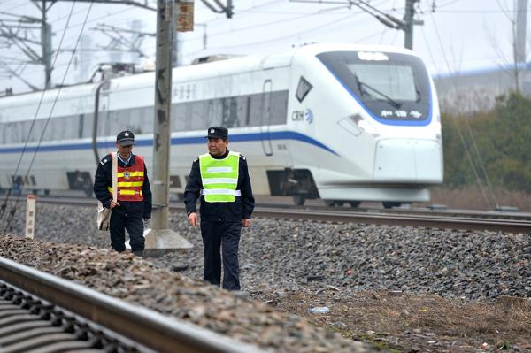 2月20日,王宝玉(右)和同事在铁路沿线巡查。王宝玉是上海铁路公安局合肥公安处合肥西站派出所的民警,他所在的长安集站位于合肥市肥西县境内,每天的主要工作是沿着铁路线路巡查。