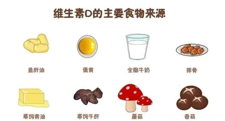 食补:日常的谷物、蔬菜、水果几乎不含维生素D;鱼肝油、蛋黄、肉类、牛奶等食物中含量也很低。