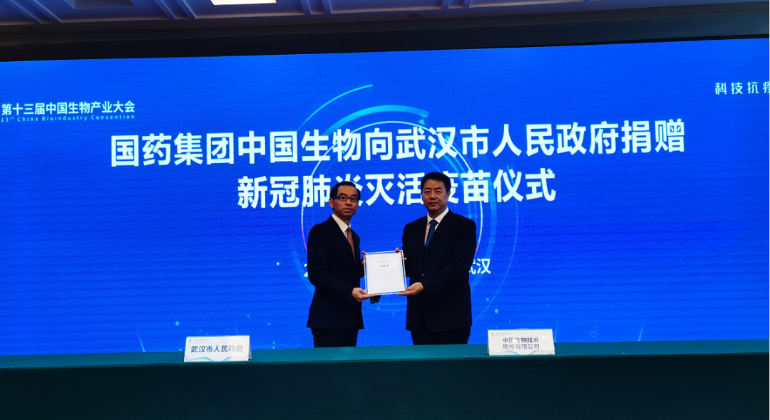 同时,国药集团中国生物技术股份公司还向武汉市人民政府捐赠10万人份(20万支)新冠肺炎灭活疫苗,用于武汉抗疫一线人员及驰援武汉的医护工作者的自身防护。国药集团中国生物董事长杨晓明代表公司向武汉市副市长陈红辉递交了捐赠书。