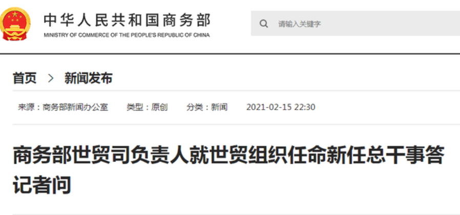奥孔乔-伊韦阿拉当选后,商务部网站刊发消息显示,中方对世贸组织新任总干事表示祝贺,对她担任世贸组织总干事充满信心。