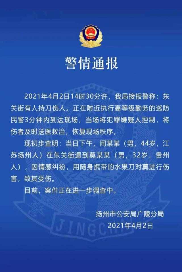 当日晚间,扬州市公安局广陵分局发布警情通报,称4月2日14时30分许,该局接到报警,称东关街有人持刀伤人。正在附近执行高等级勤务的巡防民警 3 分钟内到达现场,当场将犯罪嫌疑人控制,将伤者及时送医救治,恢复现场秩序。