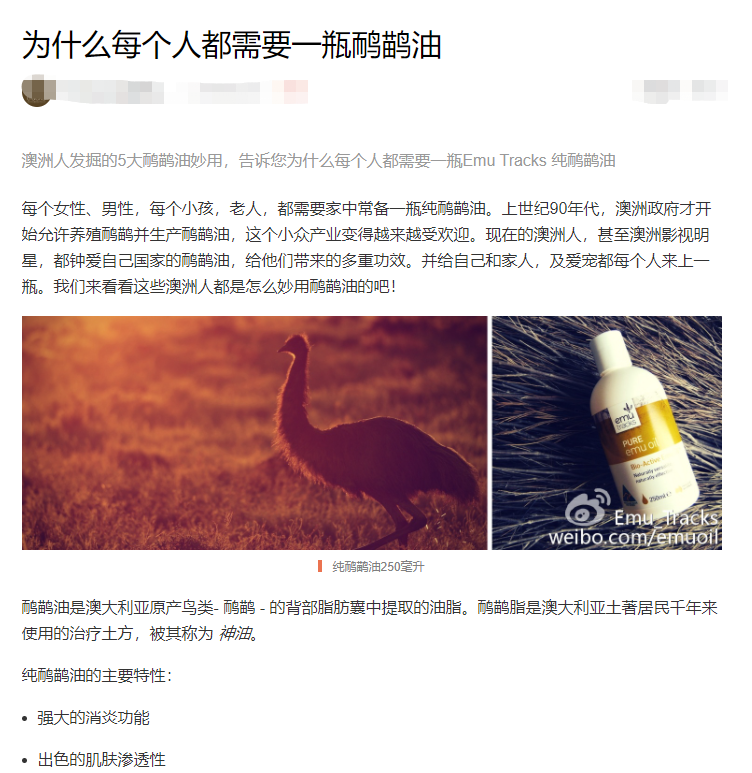 而现在,鸸鹋油也成了最有经济价值的东西,被人们用到药物、化妆品、食品中。去澳洲旅游的时候,很多导游也会推荐你买鸸鹋油的产品。现在国内很多电商、微商也都在卖这些产品,经常说鸸鹋油有护肤美容、消炎、缓解疼痛等作用。