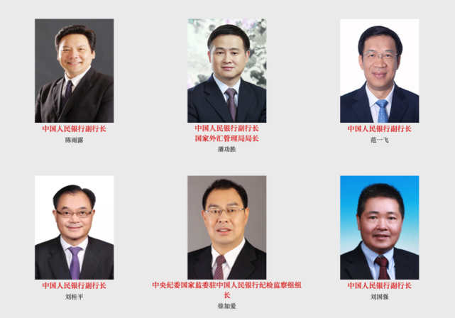 中国人民银行行长、党委副书记是易纲,党委书记、副行长是郭树清。此外还有5位副行长:陈雨露、潘功胜、范一飞、刘桂平和刘国强。