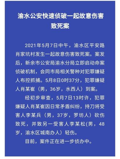 江西发生一起命案致一死一伤,疑犯已落网 渝水公安微信公众号截图