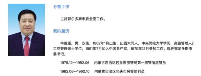 牛俊雁任自治区人大财经委员会副主任委员,不再担任鄂尔多斯市委书记职务