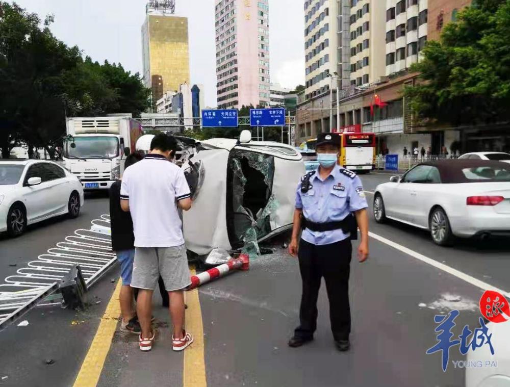 广州一小车失控侧翻被困,民警砸窗安全救人