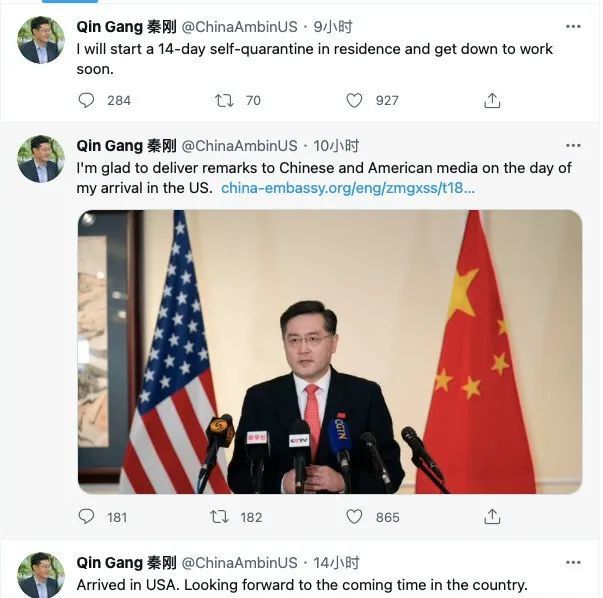 在抵达美国履新后,秦刚首次以中国驻美国大使的身份在推特上发文。当地时间28日这天,他一共发布了三条推文。内容分别是,“已抵达美国,期待在这个国家接下来的时光”,向中美媒体发表讲话,以及宣布他将开始为期14天的隔离。