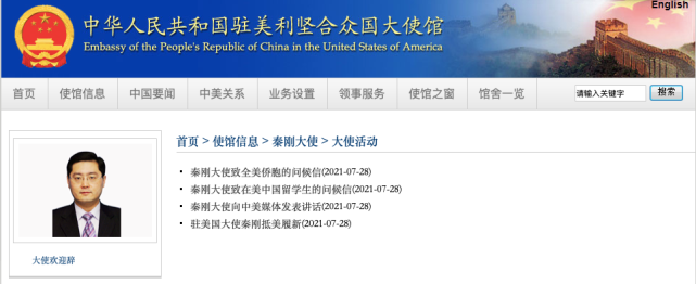 北京时间7月29日早上,驻美使馆网站在发布新大使秦刚抵达消息稿,更新大使简历的同时,还发布了一篇《秦刚大使欢迎辞》。