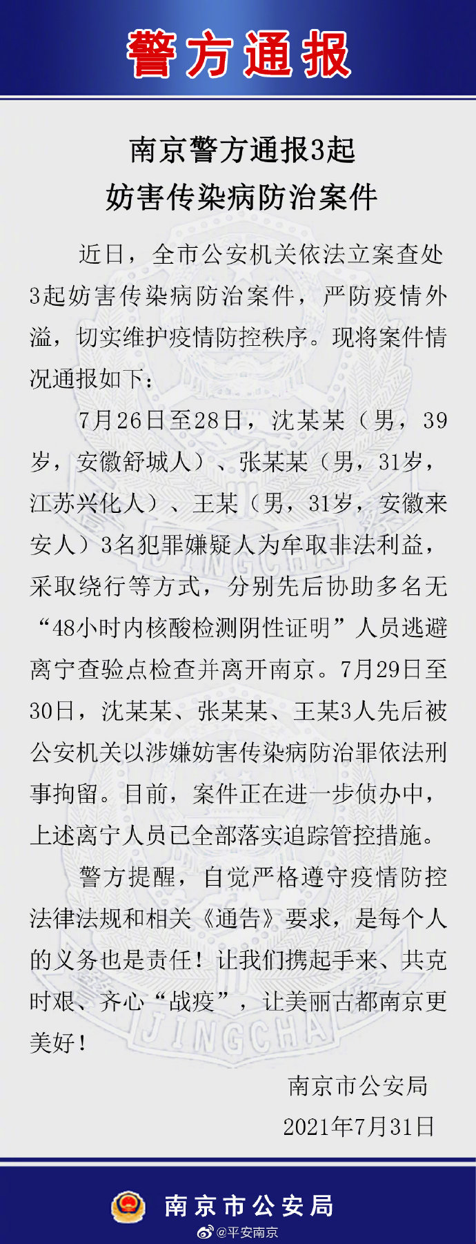 南京警方:3人因涉嫌妨害传染病防治罪被刑拘