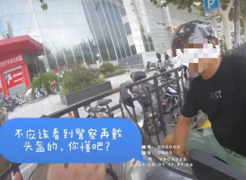 在被连续14次处罚后,8月1日在普陀区的他看到交警后才戴上了安全头盔,辖区交警再次提醒,“你不应该看到警察再戴头盔的,你懂吧?”且该男子并未将下巴处的安全扣扣好,这一次同样也被罚款。