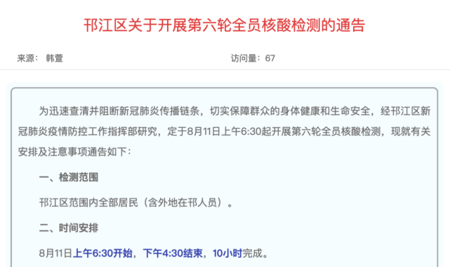 就在8月11日上午6:30起,邗江区开展第六轮全员核酸检测。