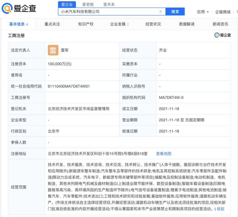 据爱企查App显示,11月18日小米汽车科技有限公司成立,法定代表人及执行董事为雷军,注册资本10亿元,经营范围含新能源车整车制造;汽车整车及零部件的技术研发;电机及其控制系统研发;智能车载设备制造等。爱企查股权穿透图显示,该公司由小米科技有限责任公司全资控股。