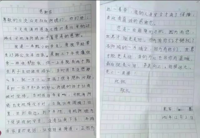 此事发生三天后,小男孩和她的妈妈来到了海女士的公司,向海女士表示感谢。男孩母亲送上一面锦旗,男孩手写了一封感谢信,笔迹稚嫩,但却真诚温暖。信中写道:“今天,我满怀感激之情对贵公司的23路女司机海阿姨给予崇高的感谢。”“您是一位超赞的司机,因为有您,世界才能更美好……”