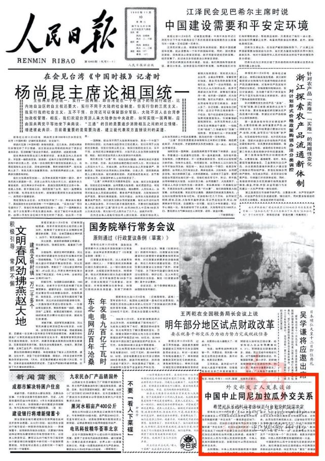 1990年11月10日《人民日报》头版刊发外交部发言人谈话