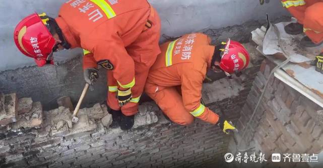 经消防救援人员现场观察,卡住男童的墙体其中一侧为临时搭建的露天猪圈,墙体砖块老化、松动,容易拆除。另一侧为居民住房。根据现场情况,现场指挥员决定从男孩被卡位置后方对猪圈一侧的墙体进行拆除,增加施救空间。为了防止在拆除过程中掉落的砖块对男孩造成二次伤害,消防人员找来一件厚棉服,从房顶顺下盖在男童身上。