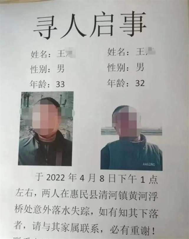 网传的寻人启事上面写道,山东滨州惠民县清河镇有两名30多岁的男子,在清河镇黄河浮桥处意外落水失踪。如有知其下落者,请与其家属联系,必有重谢!