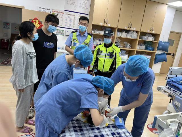 据了解,当天正是“五一”假期第一天,长安交警大队铁骑队员施谢张正在路面执勤,检查“场所码”、查验“行程卡”等落实情况,做好疫情防控有关工作。听到有群众呼救,施谢张立即向身边正在执勤的长安交警大队副大队长梁锦辉报告情况。“我当时是在长安酒店、长青街这个路口执勤,看到一对夫妻抱着婴儿跑过来向我求助。”施谢张说。