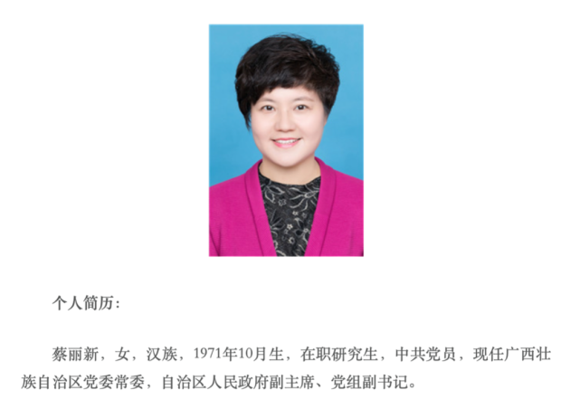 公开资料显示,蔡丽新是跨省官员,她长期在江苏省工作,担任过江苏省淮安市委书记。2021年2月跨省到广西,担任广西壮族自治区人民政府副主席。2021年11月跻身党委常委。