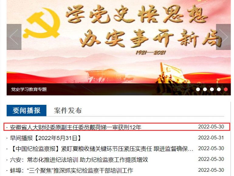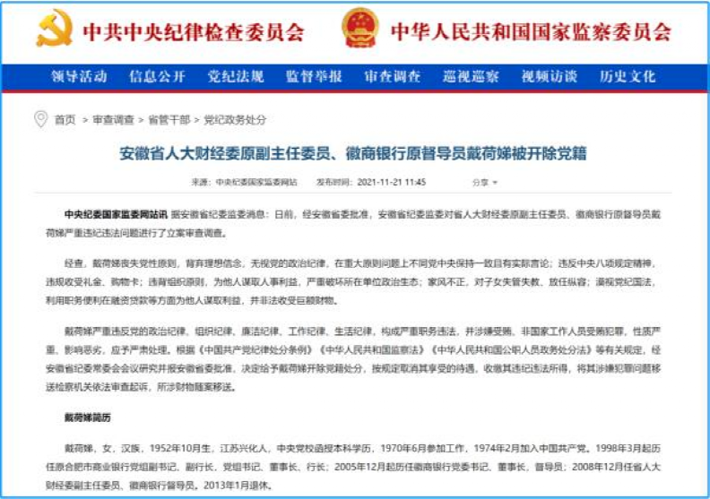 2021年11月,安徽省纪委监委发布消息称,经安徽省委批准,安徽省纪委监委对省人大财经委原副主任委员、徽商银行原督导员戴荷娣严重违纪违法问题进行了立案审查调查。经查,戴荷娣丧失党性原则,背弃理想信念,无视党的政治纪律,在重大原则问题上不同党中央保持一致且有实际言论;违反中央八项规定精神,违规收受礼金、购物卡;违背组织原则,为他人谋取人事利益,严重破坏所在单位政治生态;家风不正,对子女失管失教、放任纵容;漠视党纪国法,利用职务便利在融资贷款等方面为他人谋取利益,并非法收受巨额财物。