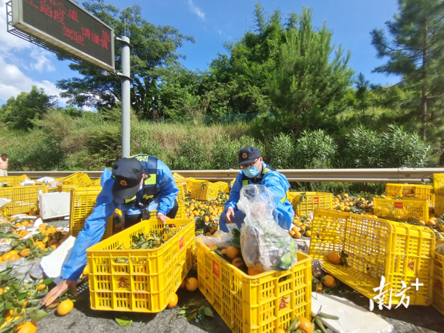 “你别急,刚已经通知交警和拯救了,我们帮忙想办法捡回来。”路政员耐心安抚陈师傅情绪后,便开始动手先将车道上一箱箱相对完好的橙子搬到路肩。随后,高速交警、拯救、抢修人员相继到达现场,也纷纷动手帮忙清运橙子。