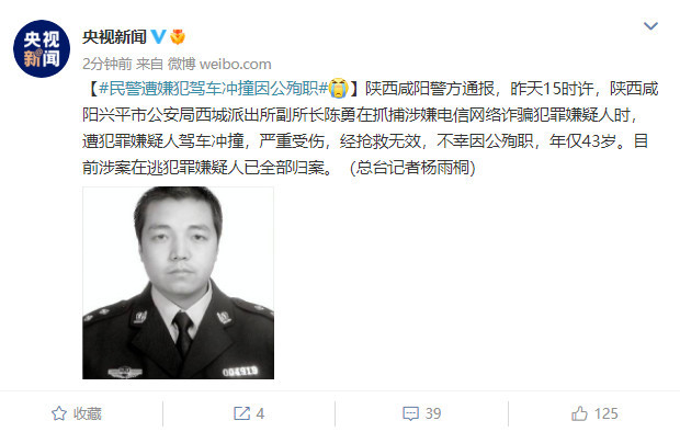 陕西咸阳警方通报,昨天(7月27日)15时许,陕西咸阳兴平市公安局西城派出所副所长陈勇在抓捕涉嫌电信网络诈骗犯罪嫌疑人时,遭犯罪嫌疑人驾车冲撞,严重受伤,经抢救无效,不幸因公殉职,年仅43岁。目前涉案在逃犯罪嫌疑人已全部归案。(总台记者 杨雨桐)