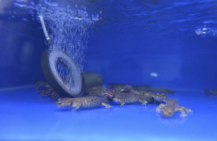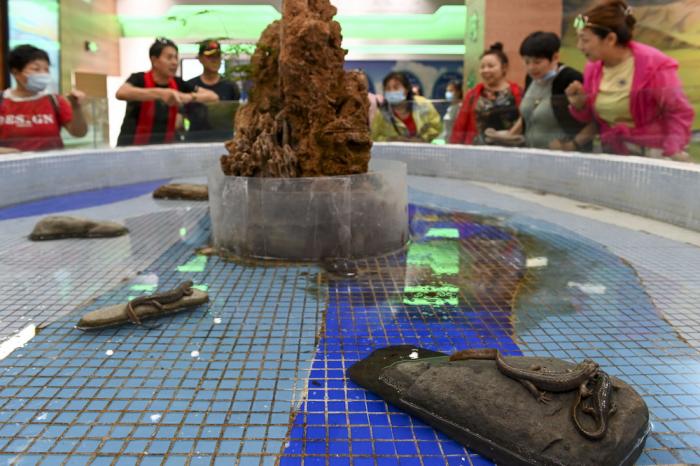 7月28日在新疆北鲵科研宣教中心的新疆北鲵人工孵化展示室内拍摄的新疆北鲵。过去受人为干扰、自然条件等因素影响,新疆北鲵的种群数量持续减少。