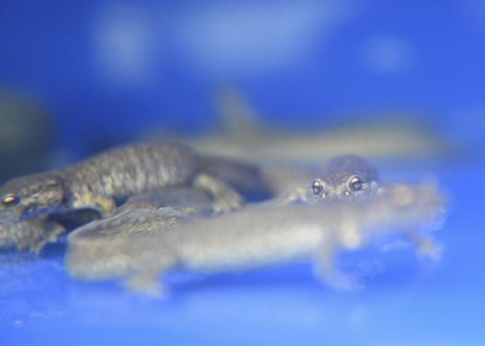 7月28日在新疆北鲵科研宣教中心的新疆北鲵人工孵化展示室内拍摄的新疆北鲵。2016年,位于温泉县的新疆北鲵科研宣教中心投入使用。现在,人们在该中心就可以近距离看到新疆北鲵生活状况、了解其演变与生物进化历程,免除了去保护区参观带给新疆北鲵的干扰,管理站的工作人员也能通过宣教中心的新疆北鲵人工孵化展示室更好地研究新疆北鲵的生长过程。