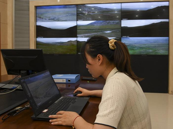 7月28日,新疆北鲵科研宣教中心的工作人员查看远程微波视频监控。