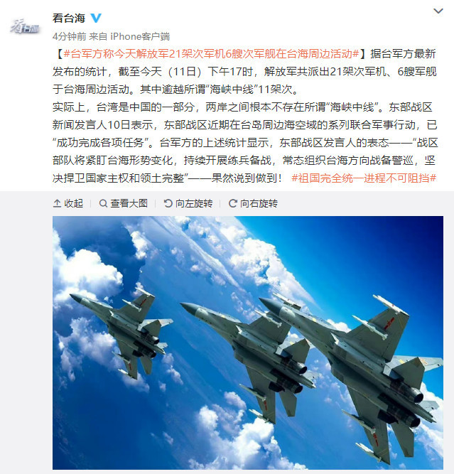 据台军方最新发布的统计,截至今天(11日)下午17时,解放军共派出21架次军机、6艘军舰于台海周边活动。其中逾越所谓“海峡中线”11架次。